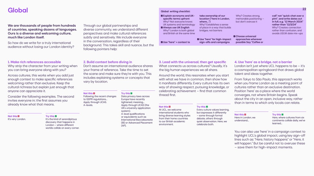 The guidelines give writers concrete tools to apply UCL’s voice consistently across contexts, balancing credibility with accessibility, ambition with honesty, and global reach with local identity.