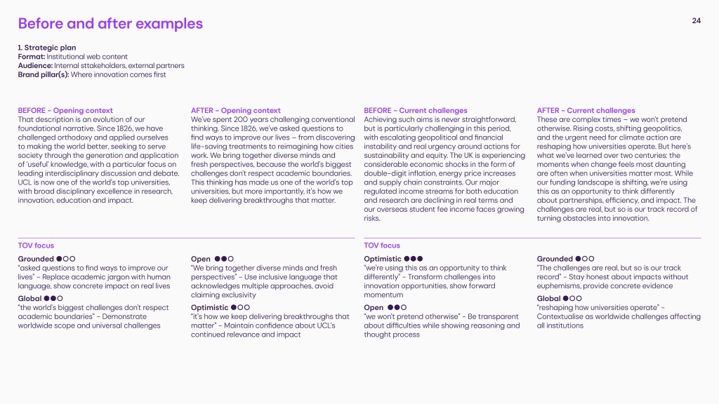 I developed comprehensive before-and-after examples across 11 different touchpoints – from UCL’s strategic plan and prospectus copy to social media posts and alumni storytelling.